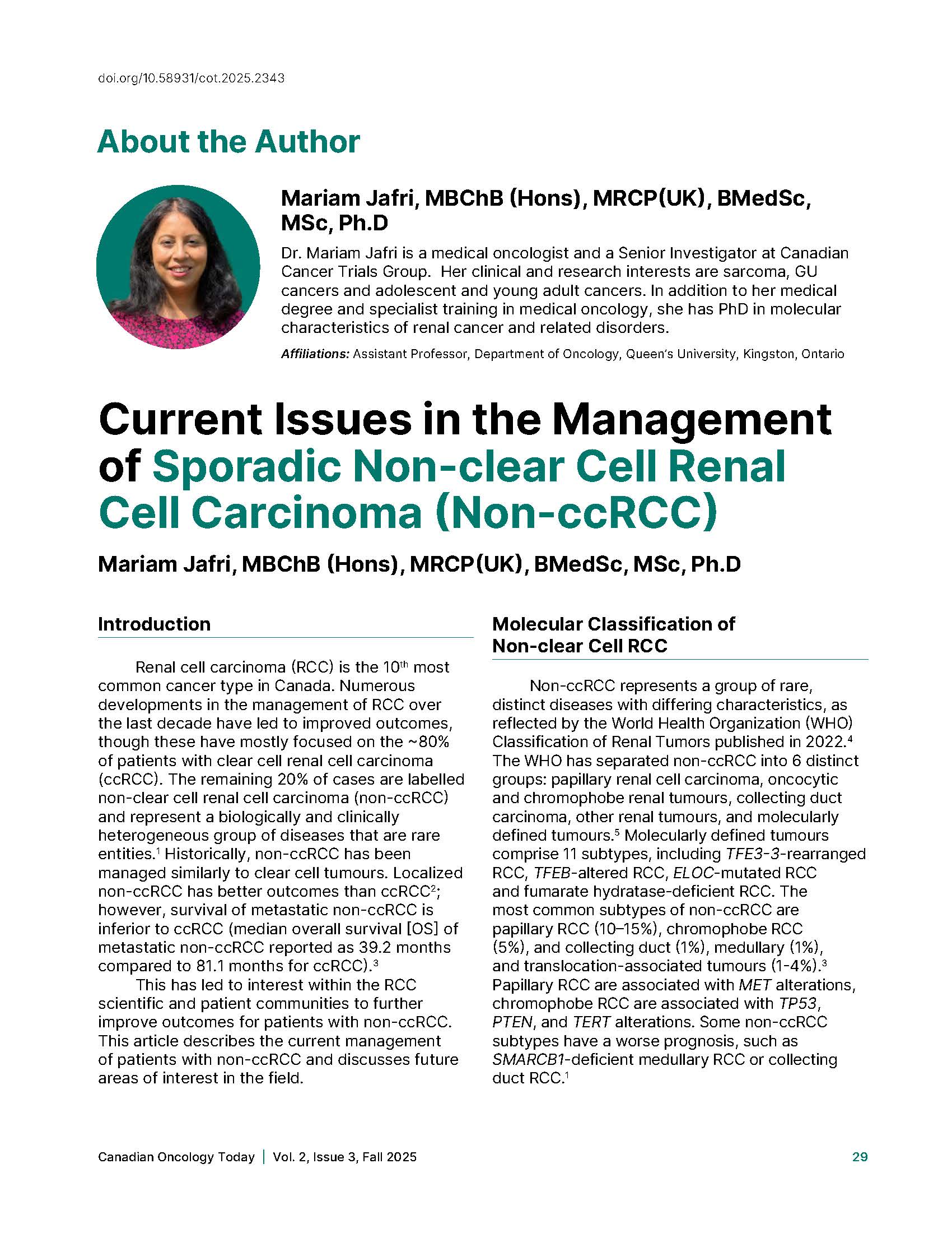 Renal cell carcinoma (RCC) is the 10th most common cancer type in Canada. Numerous developments in the management of RCC over the last decade have led to improved outcomes, though these have mostly focused on the ~80% of patients with clear cell renal cell carcinoma (ccRCC). The remaining 20% of cases are labelled non-clear cell renal cell carcinoma (non‑ccRCC) and represent a biologically and clinically heterogeneous group of diseases that are rare entities. Historically, non-ccRCC has been managed similarly to clear cell tumours. Localized non-ccRCC has better outcomes than ccRCC; however, survival of metastatic non-ccRCC is inferior to ccRCC (median overall survival [OS] of metastatic non-ccRCC reported as 39.2 months compared to 81.1 months for ccRCC).